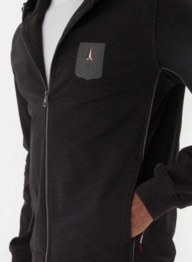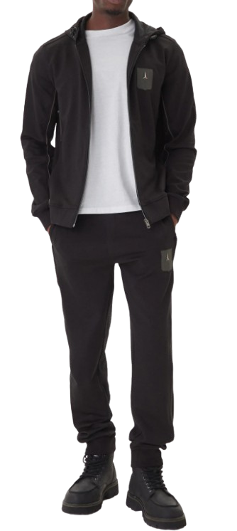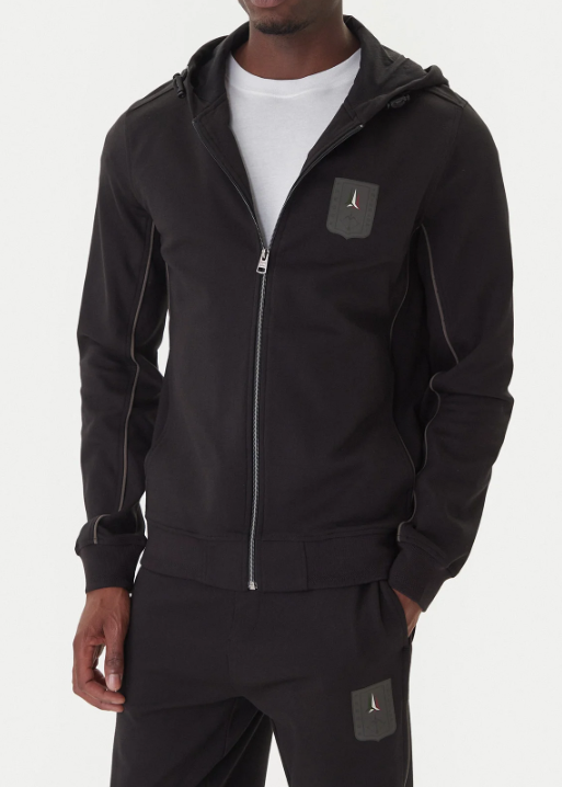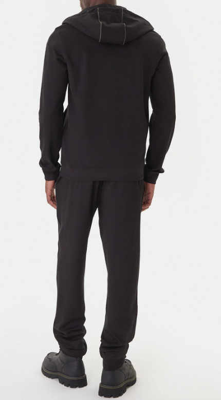W kolorze czarnym, rozpinana bluza z kapturem, spodnie zakończone ściągaczem, bardzo przyjemny materiał, logo.
