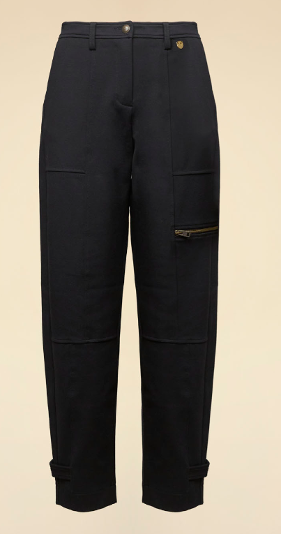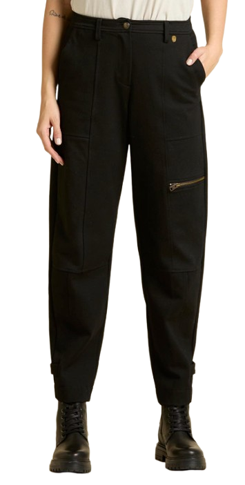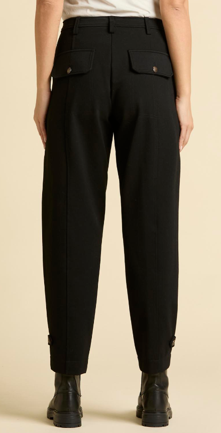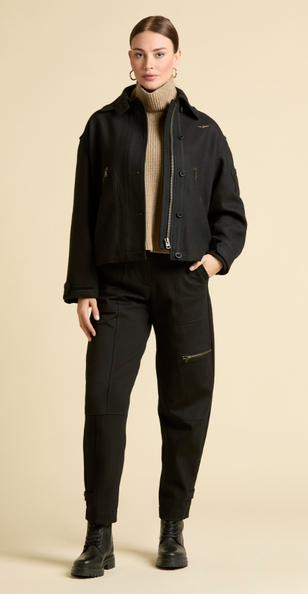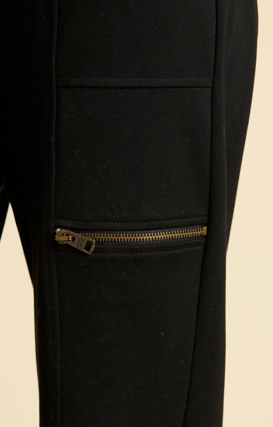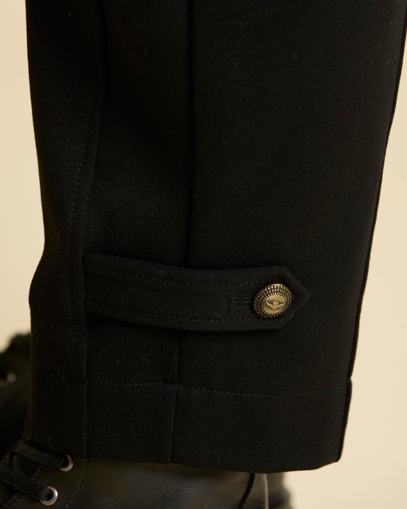 W kolorze czarnym, podwyższony stan, zapięcie na zamek z guzikiem, szlufki na pasek, kieszenie z przodu, idealne na każdą okazję, logo.