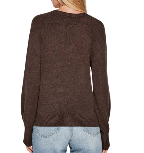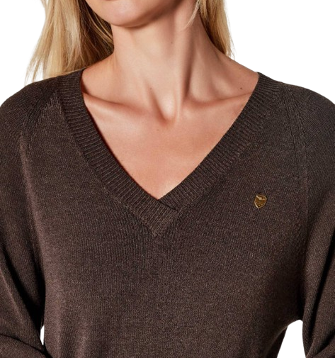 W kolorze brązowym, czekoladowym, delikatny i przyjemny w dotyku materiał, mieszanka wiskozy, grubość 7, dekolt w serek ze ściągaczem.