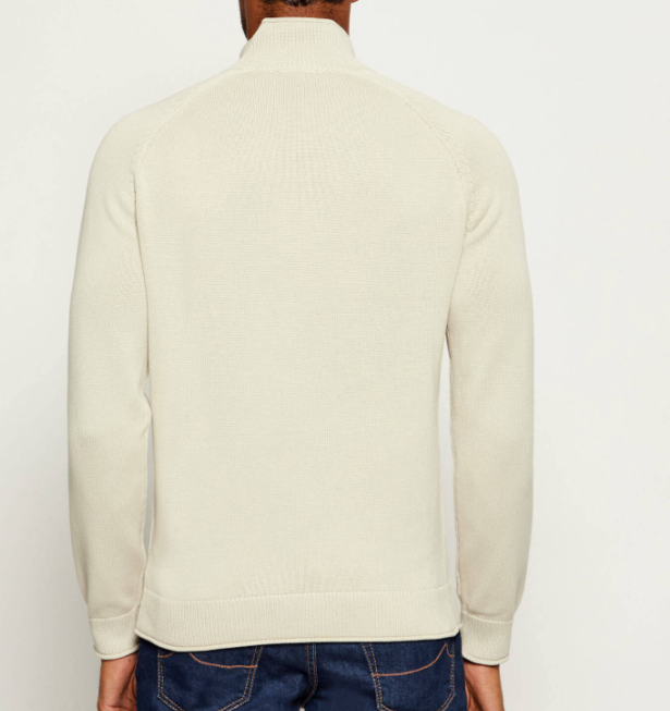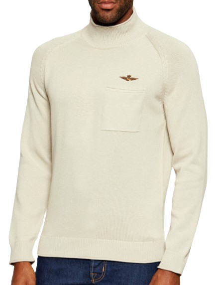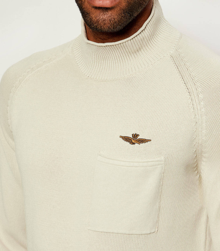 W kolorze śmietankowym, półgolf, z kieszonką, wykonany z bawełny.