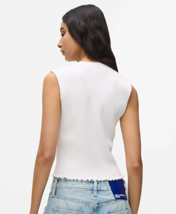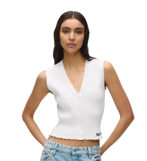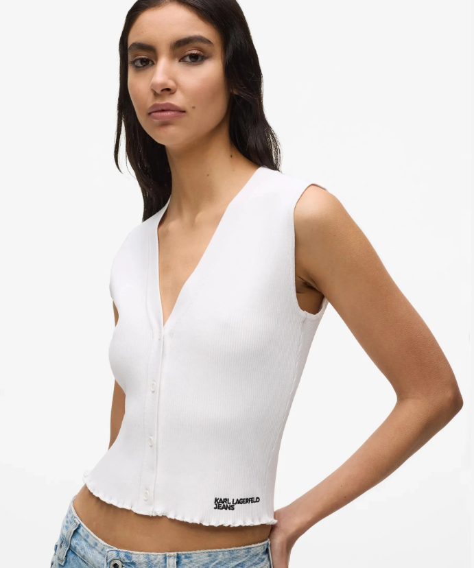W kolorze białym, haftowane logo producenta, na grubszych ramiączkach, zapinany na guziki.