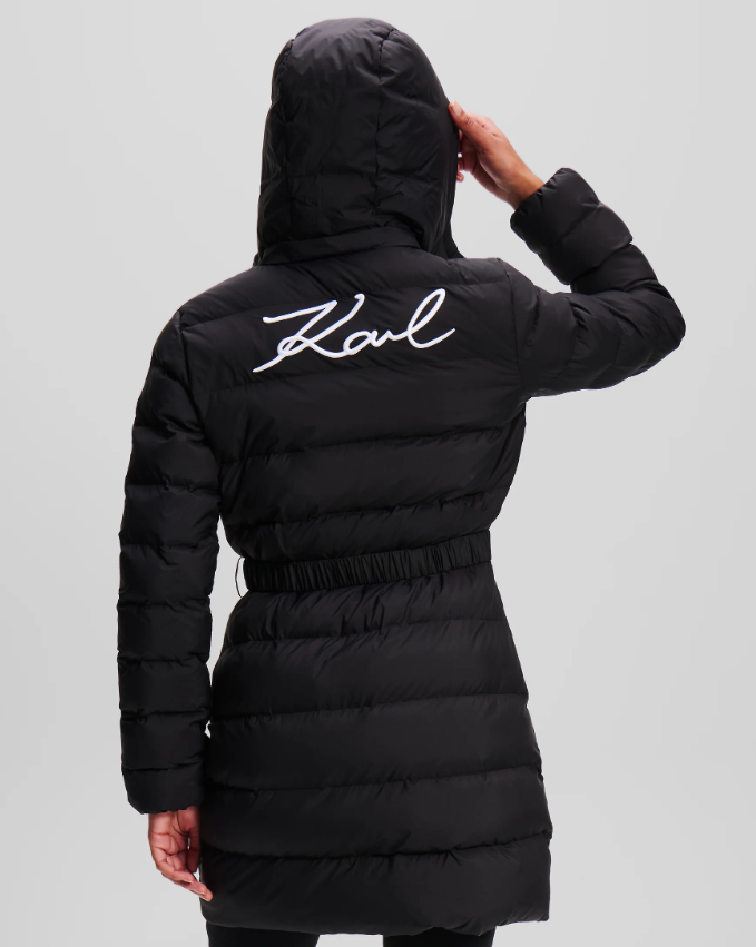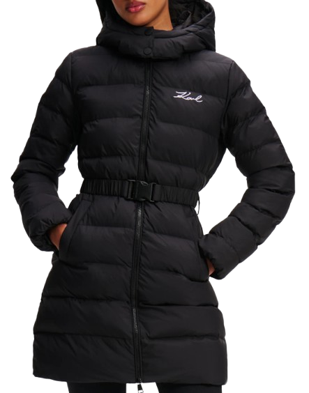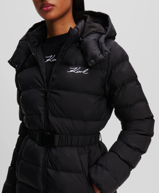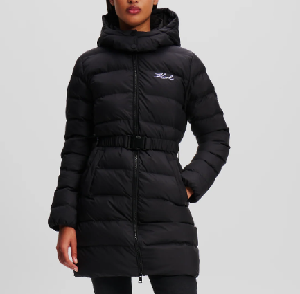 W kolorze czarnym lekki puch, odpinany kaptur i pasem w talii, ciepła i stylowa, zapinana na zamek, z kieszeniami.