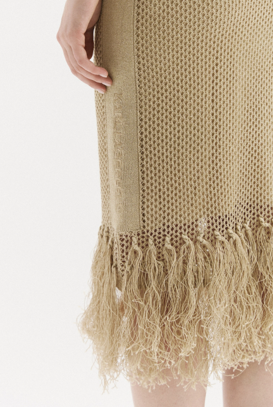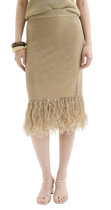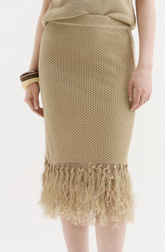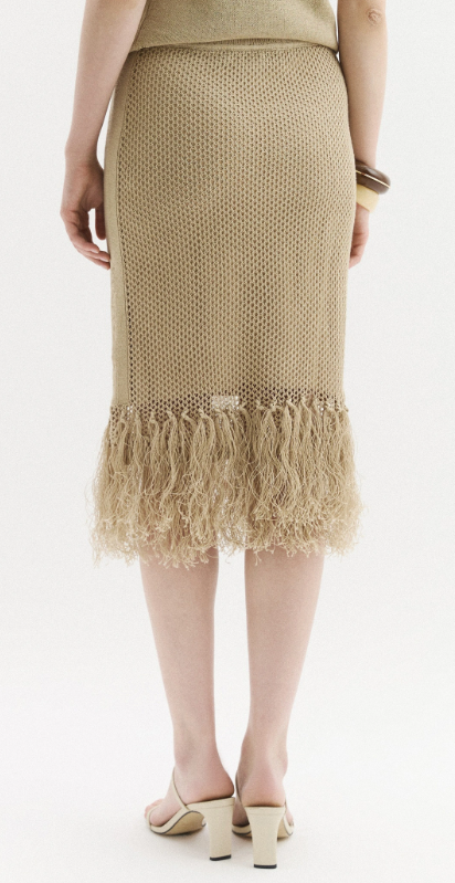 W kolorze beżowym, odcień safari, ołówkowa, długość do połowy łydki, ażurowy wzór, elastyczny ściągacz w pasie, ozdobiona frędzlami, logo po boku.