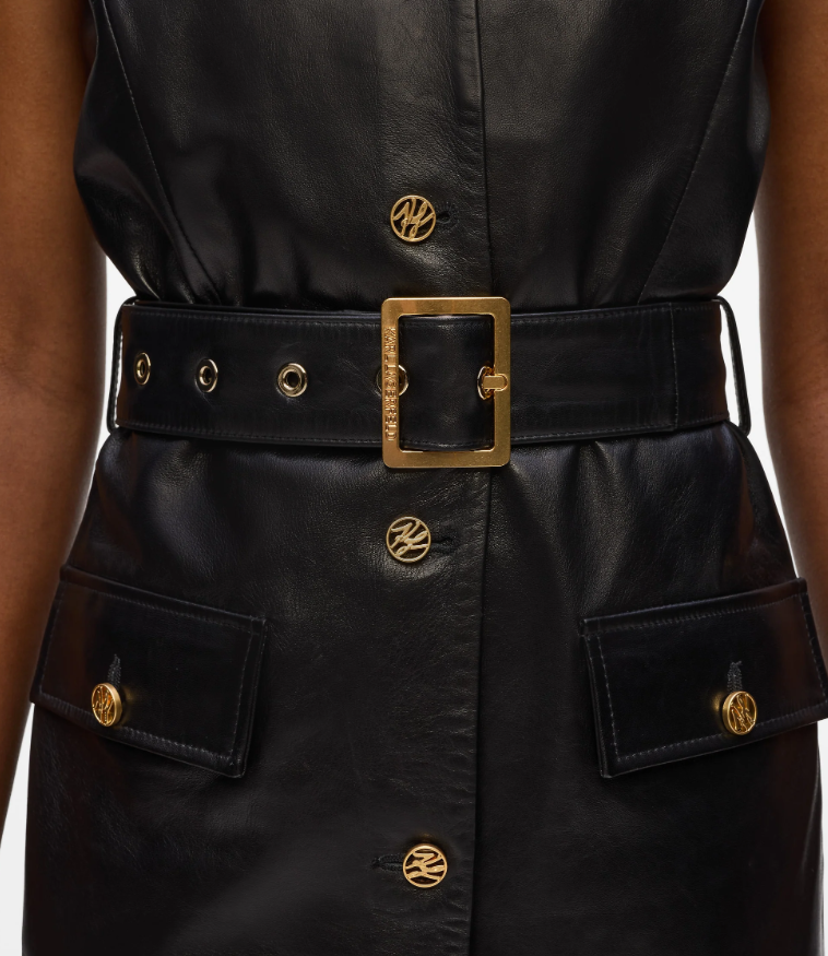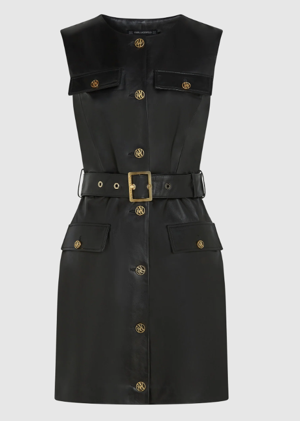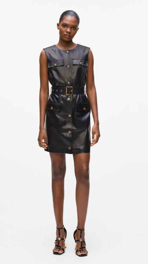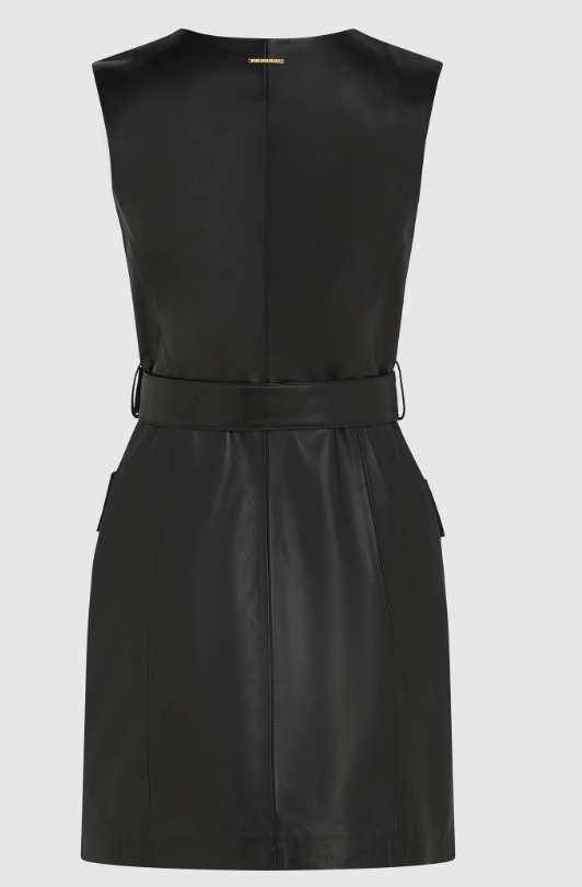 W kolorze czarnym, długość mini, krój bez rękawów, zapięcie na guziki z przodu, pasek ściągający z brandowaną złotą klamrą, elegancki styl.
