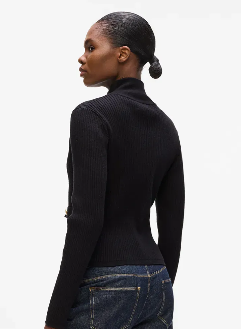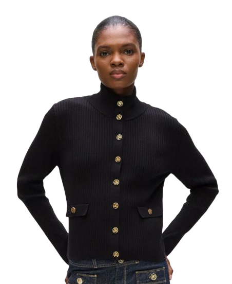 W kolorze czarnym, dopasowany fason, imitacja kieszeni z przodu, prążkowana tekstura materiału, wygodne zapięcie na zatrzaski ułatwia zakładanie i zdejmowanie.