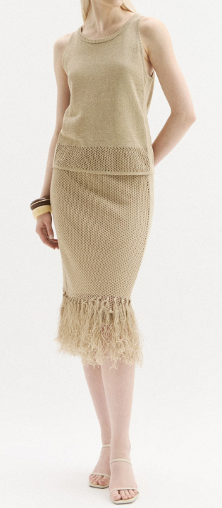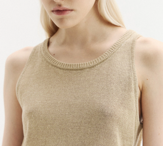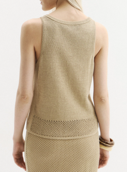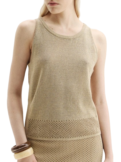 W kolorze beżowym, odcień safari, ozdobiony ażurowymi wstawkami, haftowane logo producenta po boku, na ramiączkach.