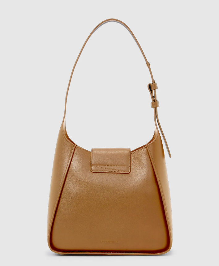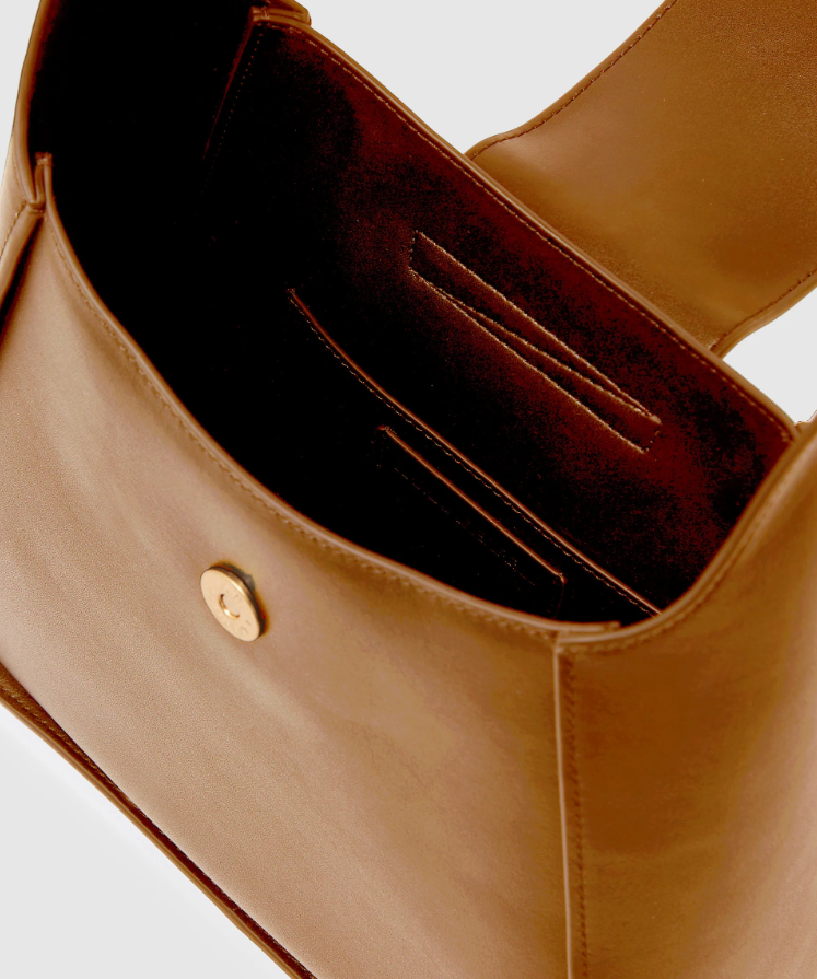 W kolorze karmelowym, logo, złote okucia, zapinana na magnes, możliwość regulacji paska, wykonana z najwyższej jakości skóry.