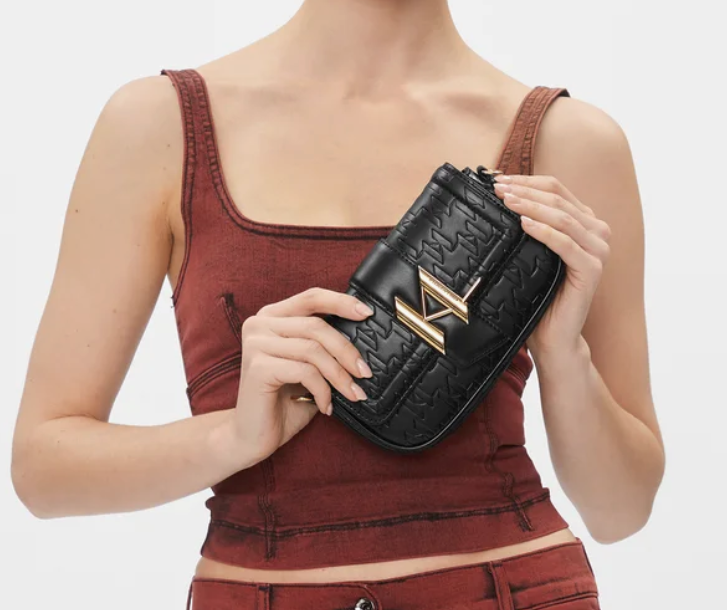 Mała torebka, w kolorze czarnym, ze złotym logo.